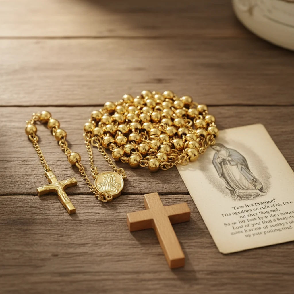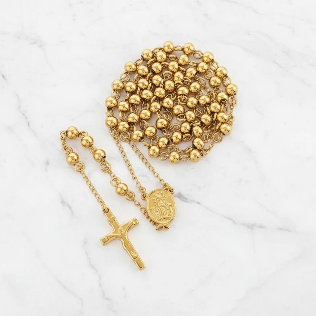 No es solo un rosario, es una declaración de estilo. Las cuentas pulidas doradas combinan tu devoción con una elegancia que todos notarán. Brilla con tu fe.